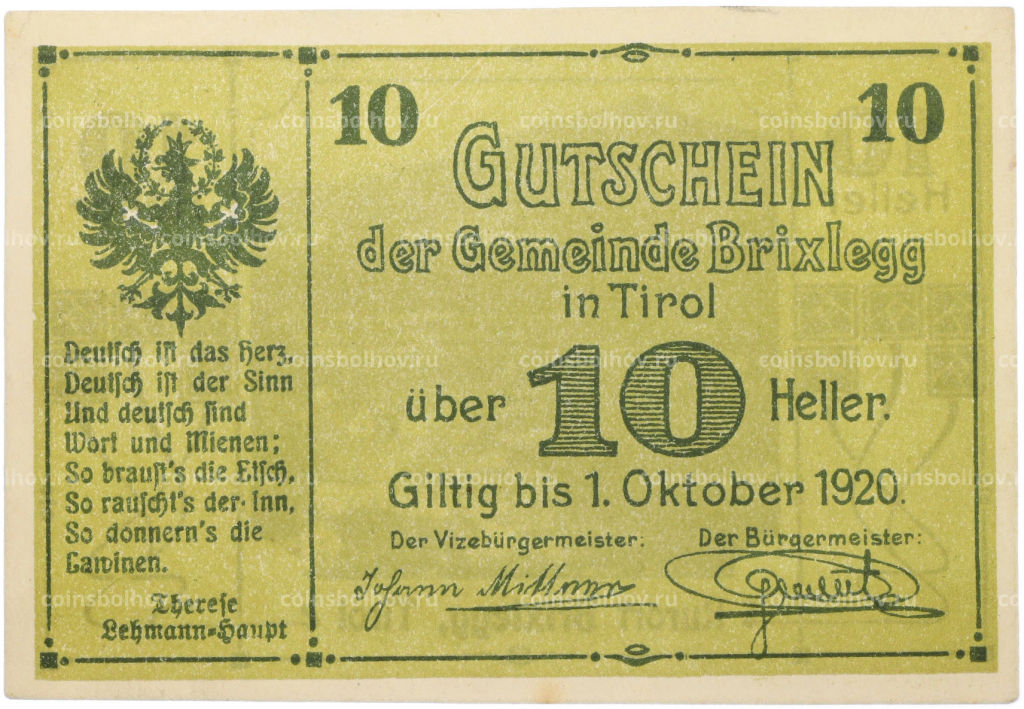 • Банкнота 10 геллеров 1920 года Австрия  община Брикслегг в Тироле (Нотгельд)
