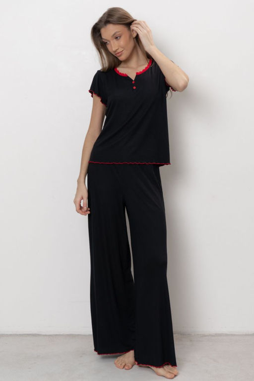 Струящаяся пижама из нежной вискозы состоит из футболки с коротким рукавом и свободных брюк. Пояс струящихся брюк на мягкой резинке. Вырез горловины футболки круглый. Вырез горловины декорирован нежным контрастным кружевом и функциональной планкой, а все срезы пижамы игривой отстроцкой.