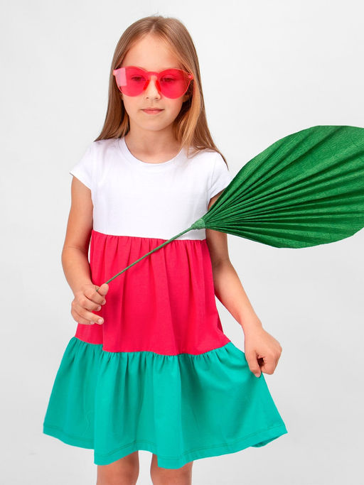 Платье для девочки свободного силуэта - трапеция. Легкий, натуральный материал-кулирка прекрасно пропускает воздух, обладает высокими гипоаллергенными свойствами. Идеальное решение для отдыха или прогулки в жаркий, летний день.