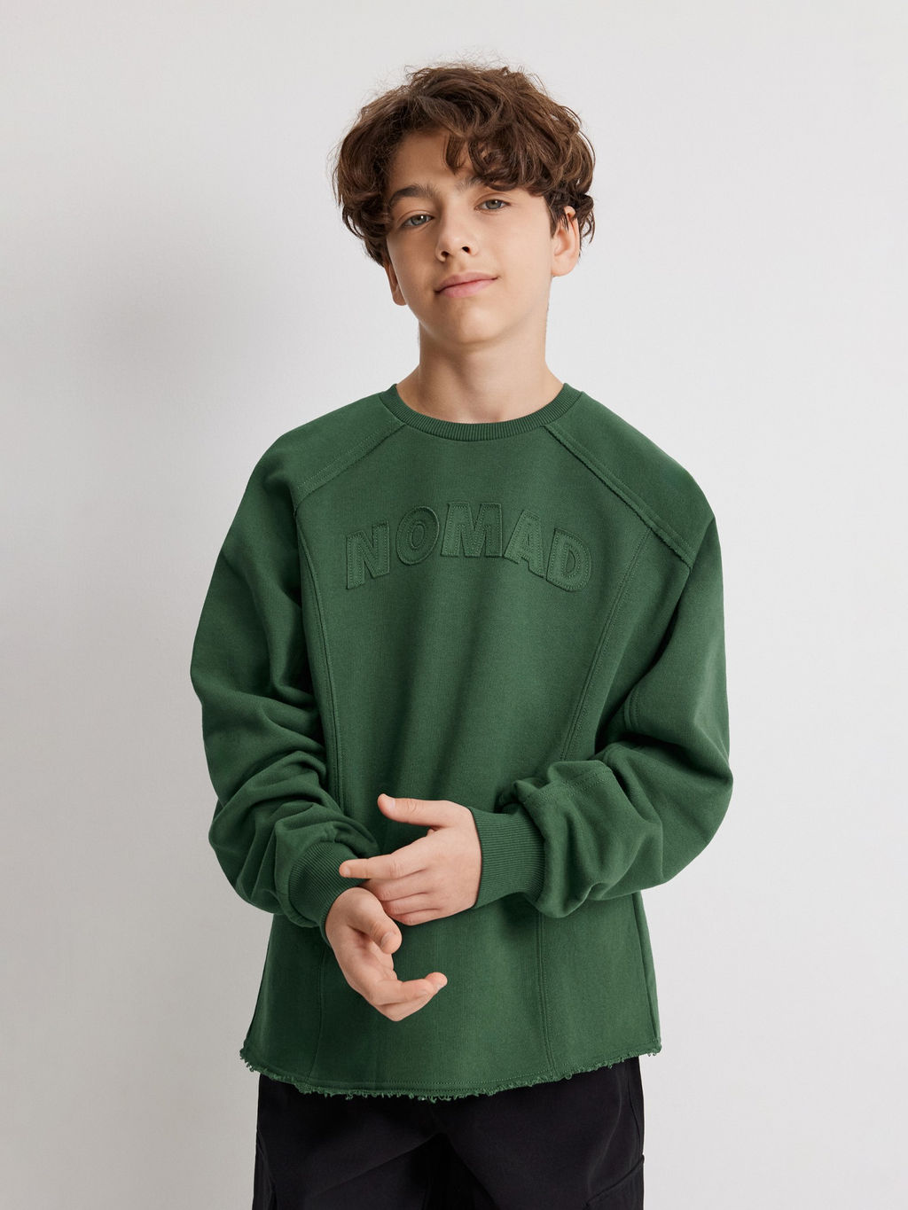 Свитшот с рваным низом для мальчика это стильная модель, призванная разнообразить гардероб подростка. Свитер изготовлен из футера с петлями на изнанке (без начеса), благодаря чему он подходит для ношения в теплое время года и составления многослойных сложных образов в демисезон. Модель посадки comfort предлагает свободный крой, приспущенную линия плеча, а также увеличенные объем и длину рукава. Всё это создает расслабленный силуэт и дарит легкость движений. Округлая горловина, манжеты и низ изделия из рибового полотна плотно прилегают к телу и сохраняют форму изделия. Спереди расположена аппликация в виде надписи "NOMAD" англ. - "Кочевник". Стильный вид свитшоту придают рельефные швы и необработанная линия низа, которая вносит в лук смелый штрих. Рваный свитшот составит стильный образ с надетым под низ полосатым лонгом (20330150003) и брюками карго (20110160439).20110170187