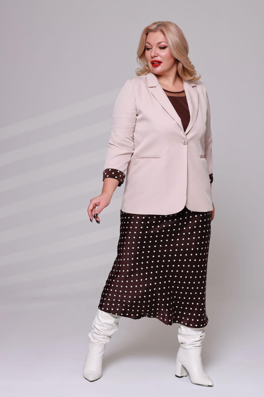 Костюм жакет бежевый с юбкой в горошек темно-коричневый­