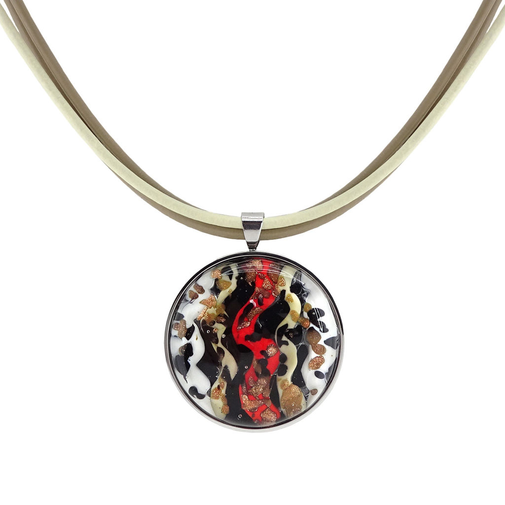 Колье изготовлено из натуральной кожи, муранского стекла и гипоаллергенной ювелирной стали, что очень важно для людей с чувствительной кожей. Металл не темнеет и не подвергается воздействиям окружающей среды, надолго обеспечивая красивый внешний вид изделия. Длина колье - 46 см + 5 см. удлиняющая цепочка. Диаметр стеклянного элемента - 3 см. Вес - 23 гр.