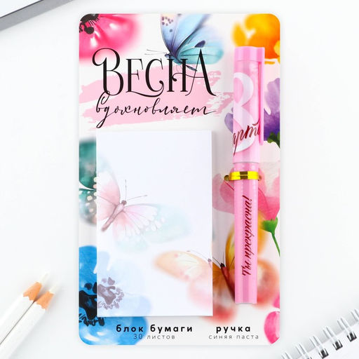 Цена за 2 шт. Подарочный набор, ручка шариковая и блок бумаги 30 л Весна вдохновляет. 8 марта