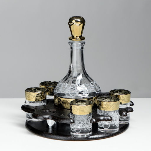 Мини-бар "Столичный. Вдохновение" - классика и стиль в каждой детали. Идеальное сочетание классического дизайна и практичности. Элегантный золотистый цвет и изящный стиль прекрасно дополнят любой интерьер. Удобные секции позволяют компактно разместить все необходимое. Графин идеально подходит для хранения водки или других крепких напитков, а стопки – для удобной сервировки. Настольное крепление обеспечивает его мобильность и удобство в использовании.Перимущества:Классический дизайн: элегантный золотистый цвет и изысканный стиль.Высокое качество: графин и стопки изготовлены из прочного стекла.Удобство: настольное крепление и компактный размер.Практичность: все предметы находятся в одном наборе. В наборе, шт.: 7. Количество секций: 7. Объём бокала/рюмки, мл: 50. Объём графина/штофа, л: 500. Рисунок: Да. Назначение: Для водки/ликера. Вид установки: Настольный. Можно мыть в посудомоечной машине: Нет. Посуда в комплекте: Да.