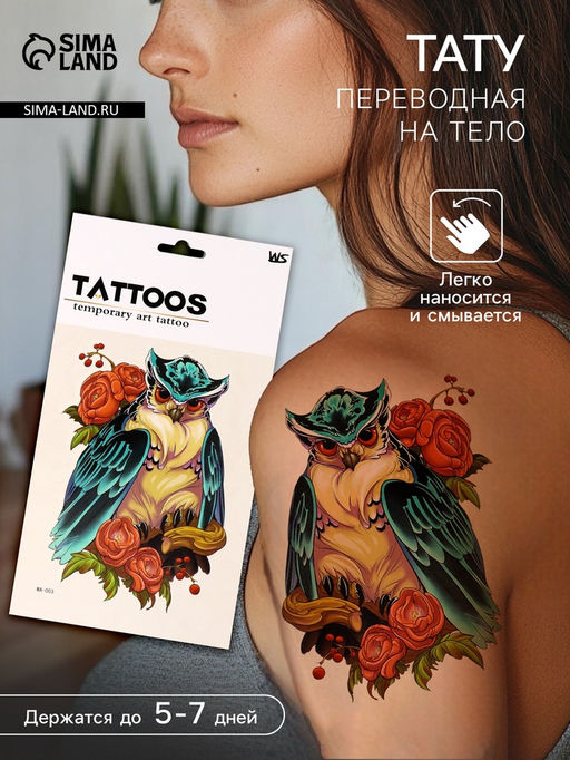 • Цена за 2 шт. Переводная тату на тело цветная Сова в пионах, 26.1?14.6 см
