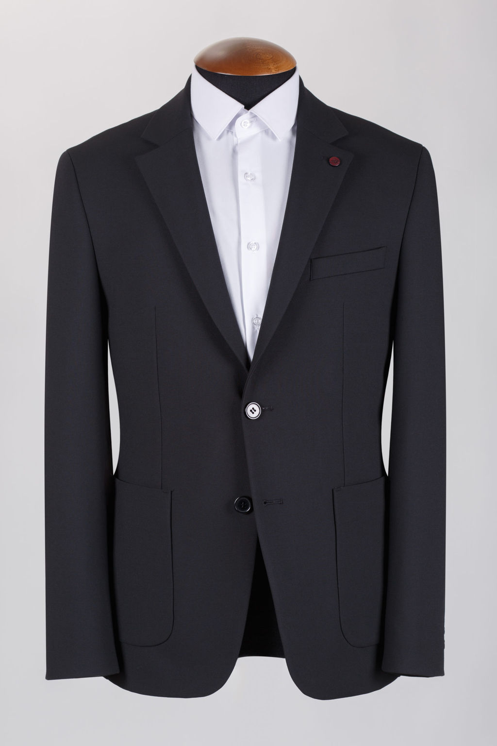 Пиджак прилегающего силуэта (Slim), однобортный, с застежкой на две петли, с прямыми лацканами.
