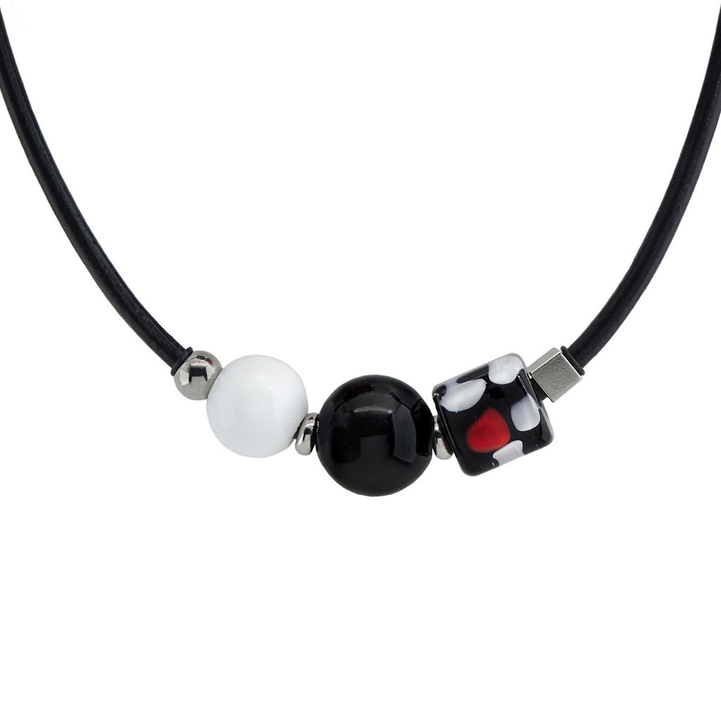 Колье изготовлено из натуральной кожи, муранского стекла и гипоаллергенной ювелирной стали, что очень важно для людей с чувствительной кожей. Металл не темнеет и не подвергается воздействиям окружающей среды, надолго обеспечивая красивый внешний вид изделия. Длина колье - 46 см + 5 см. удлиняющая цепочка. Диаметр стеклянных шароов - 1,6 и 1,2 см. Размер куба - 1,2х1,4 см. Вес - 32 гр.