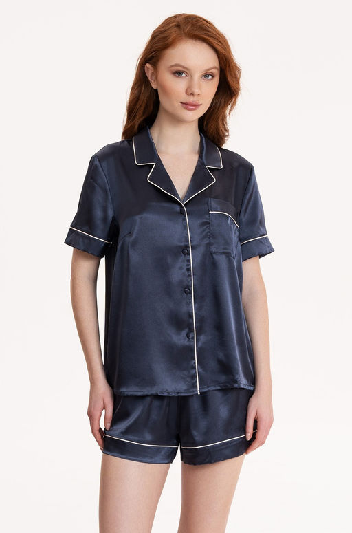 Комплект Mia-Mella состоит из рубашки с центральной застежкой на пуговицы с короткими рукавами и шорт. Комплект выполнен из искусственного принтованного шелка. Жакет и шорты оформлены кантом. Состав:100% полиэстер
