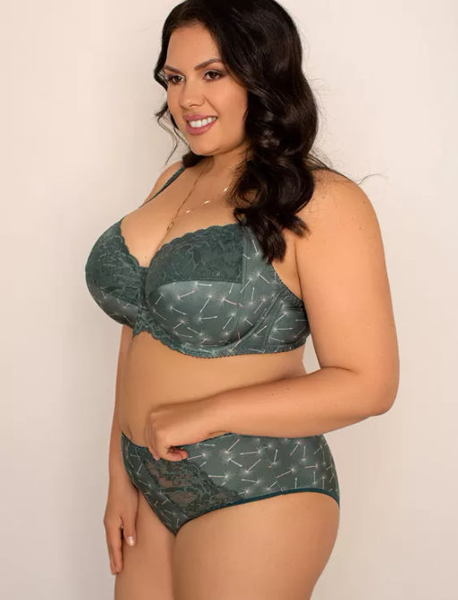 Комбинированная чашка из эластичного кружева и эластичного принтованного полотна, дублированного хлопком. На каркасах. Кружево дублировано сеткой, а бочок тонким софтом.