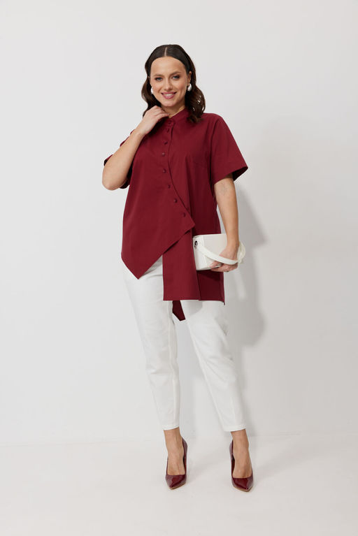 Блуза свободного силуэта, выполненная из рубашечной ткани на хлопковой основе (тянется). По переду ассиметричная застежка на петли-пуговицы. По спинке отрезная кокетка. Низ блузы ассиметричный, разноуровневый по длине. Горловина оформлена воротником-стойкой. Рукав втачной, одношовный с манжетой.