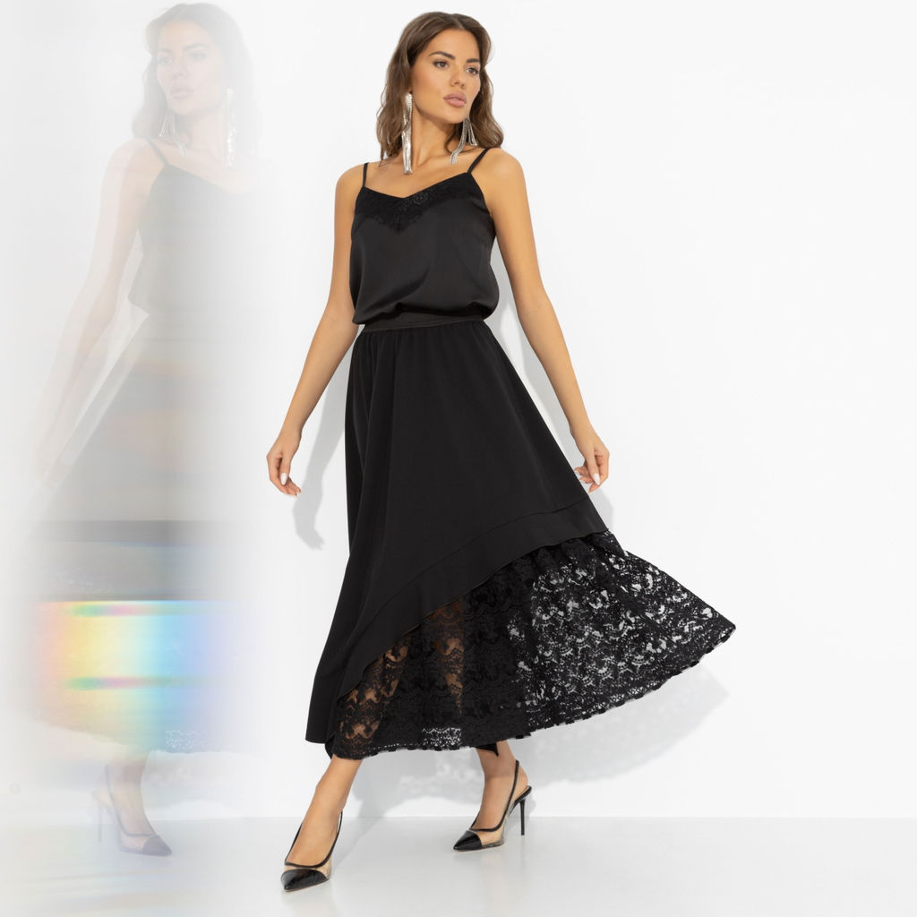 Фасон юбки: Широкая Параметры модели на фото: Грудь: 88 см Талия: 61 см Бёдра: 89 см Рост: 170 см. Размер на модели: 44 Длина изделия: * 44 размер - 90 см * 46 размер - 90 см * 48 размер - 90 см * 50 размер - 90 см * 52 размер - 90 см * 54 размер - 90 см Обхват талии: * 44 размер - 70 см * 46 размер - 74 см * 48 размер - 78 см * 50 размер - 82 см * 52 размер - 86 см * 54 размер - 90 см Обхват бёдер: * 44 размер - 120 см * 46 размер - 124 см * 48 размер - 128 см * 50 размер - 132 см * 52 размер - 136 см * 54 размер - 140 см Вес товара, кг: * 44 размер - 0.37 * 46 размер - 0.39 * 48 размер - 0.4 * 50 размер - 0.45 * 52 размер - 0.49 * 54 размер - 0.52 Габариты товара (ДхШхВ), см.: * 44 размер - 32 х 32 х 3 * 46 размер - 32 х 32 х 3 * 48 размер - 32 х 32 х 3 * 50 размер - 32 х 32 х 3 * 52 размер - 32 х 32 х 3 * 54 размер - 32 х 32 х 3 На первый взгляд это сдержанная чёрная юбка, подходящая для сотни поводов. Но стоит вам сделать шаг, и кружевной слой приоткрывается, добавляя в образ интригу и обещание продолжения истории после официальной части вечера. Юбка для тех вечеров, когда хочется быть центром чувств. Асимметричный подол мягко раскрывает вышитое кружево на сетке, создавая ощущение многослойности и глубины. Юбка миди легко сочетается с лаконичными топами и жакетами, превращая строгий образ в утончённый и запоминающийся. Пояс на резинке. -- Характеристики -- ТН ВЭД: 6204530000 Состав: Костюмная ткань барби, вышивка на сетке (98% п/э, 2% спандекс) Плотность ткани: Средняя Тип ткани: Трикотаж, текстиль Вид застежки: Нет Декоративные элементы: Рюши Карманы: Нет Основной цвет ткани: Черный Подклад: Нет Резинка по талии: Есть Рисунок/раппорт: Нет, все изделия идентичны Сезон: Круглогодичный Стиль: Нарядный Фасон юбки: Широкая