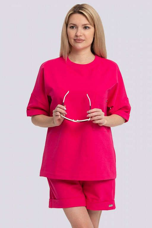 Хотите удобный летний женский костюм с шортами, но не знаете какой выбрать? Комплект с шортами и футболкой выполнен из плотной хлопковой ткани футер 2х-нитка. Трикотаж не скатывается и не растягивается даже при многочисленных стирках и постоянной носке. Летний комплект состоит из базовой футболки и широких удлиненных шорт с карманами. Этот спортивный костюм отлично подойдёт для прогулок и путешествий. Костюм оверсайз очень удобный и комфортный, не сковывает движений. Модель идеальна для летних прогулок в городе, активного отдыха и повседневной жизни. Футболку с прямым силуэтом oversize и спущенным рукавом можно комбинировать с джинсами или спортивными штанами. Шорты трикотажные на широкой резинке можно комбинировать с топом или майкой, взять с собой на занятия спортом или фитнесом. Футболка свободного кроя. Спущенная линия плеча. По низу рукава отворот. Отличительный элемент - нагрудный накладной карман. Шорты свободного кроя, пояс на резинке. В боковых швах карманы. По низу брючин отвороты. Состав трикотажа: 75% хлопок, 20% полиэстер, 5% спандекс. -- Характеристики --