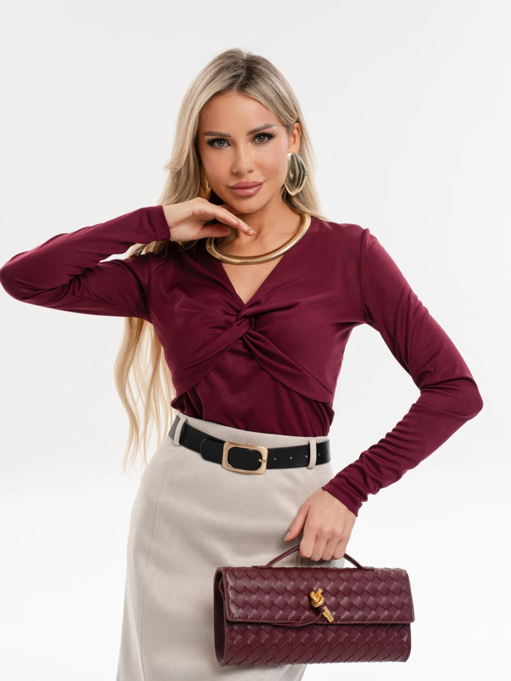 Блузка прилегающего силуэта из эластичного трикотажа.