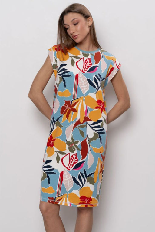 "Платье домашнее со спущенным рукавом и фигурной проймой. Вырез горловины круглый, обработан обтачкой из рибаны.