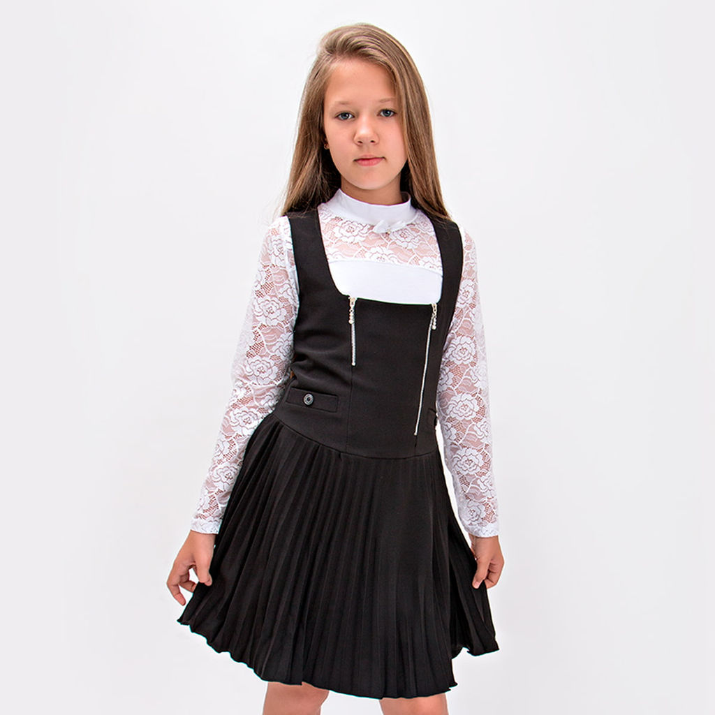 Эффектный, школьный сарафан для девочки. Прилегающий верх дополнен двумя декоративными молниями. Свободная юбочка украшена плиссировкой. Идеально сочетается с любой блузкой и отлично вольется в школьный гардероб.