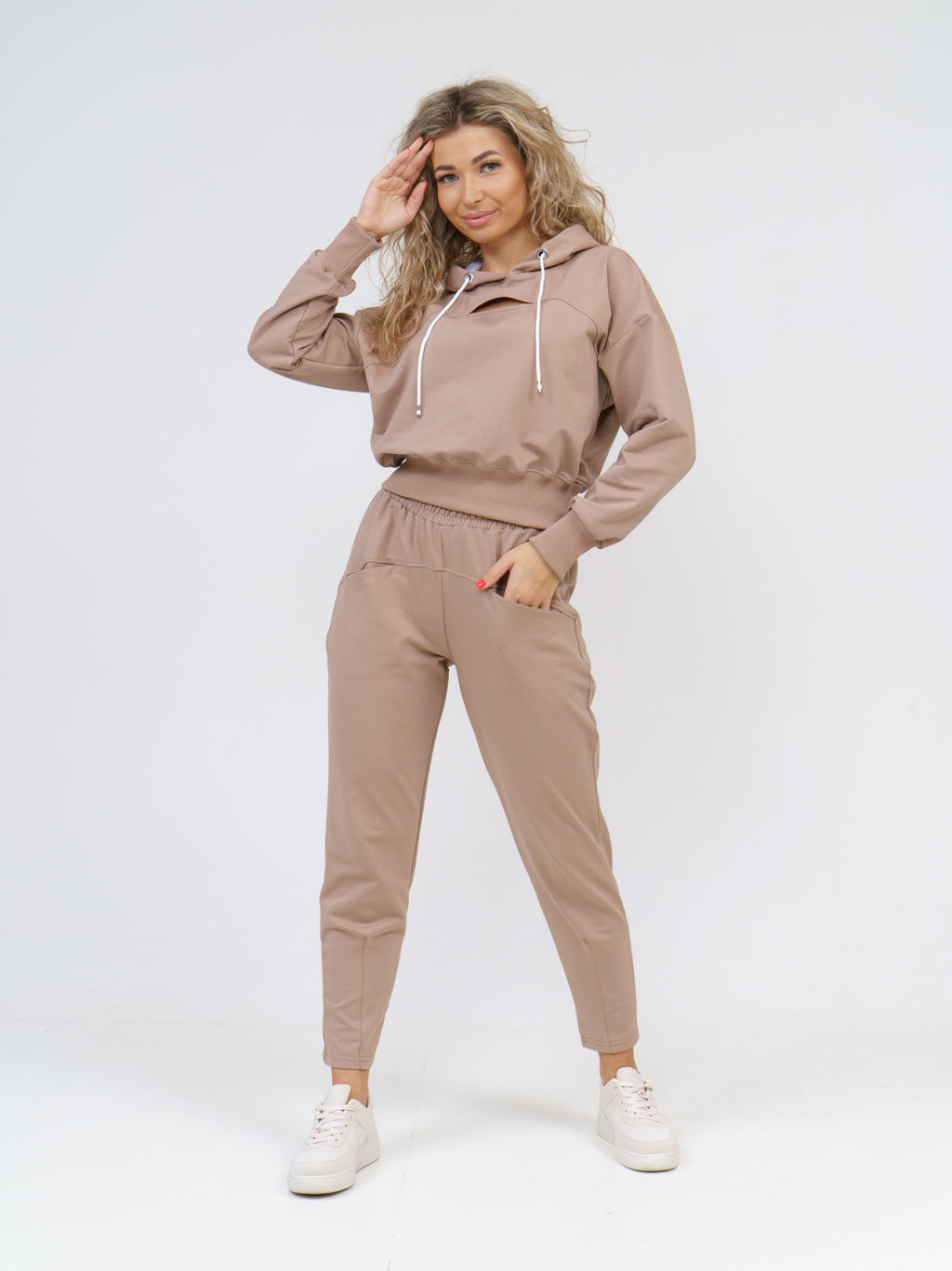 Идеальный вариант для прогулок, встреч с друзьями, легких тренировок или просто комфортного отдыха дома. Лаконичный дизайн в нейтральной цветовой гамме делает этот костюм базовой вещью в гардеробе, которая легко комбинируется с другой одеждой. Особенно хорошо он подойдет женщинам невысокого роста, так как укороченный крой худи и завышенная талия брюк визуально вытягивают силуэт.
