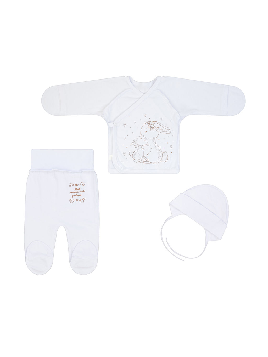 Комплект для новорожденных из нежного трикотажа (хлопок). Состоит из трех предметов: распашонки, ползунков и чепчика. Распашонка на запАх с удобной застежкой на кнопку сбоку, спереди лаконичный милый рисунок. Рукава длинные со специальным клапаном для закрытия маленьких ручек. Края обработаны трикотажной бейкой. Короткие ползунки с закрытыми ножками на широком эластичном поясе (еврорезинка), небольшой текстовый принт сверху. Чепчик с завязочками край обрамлен эластичными трикотажем. Комплект сшит из однотонного трикотажа белого цвета швами наружу.