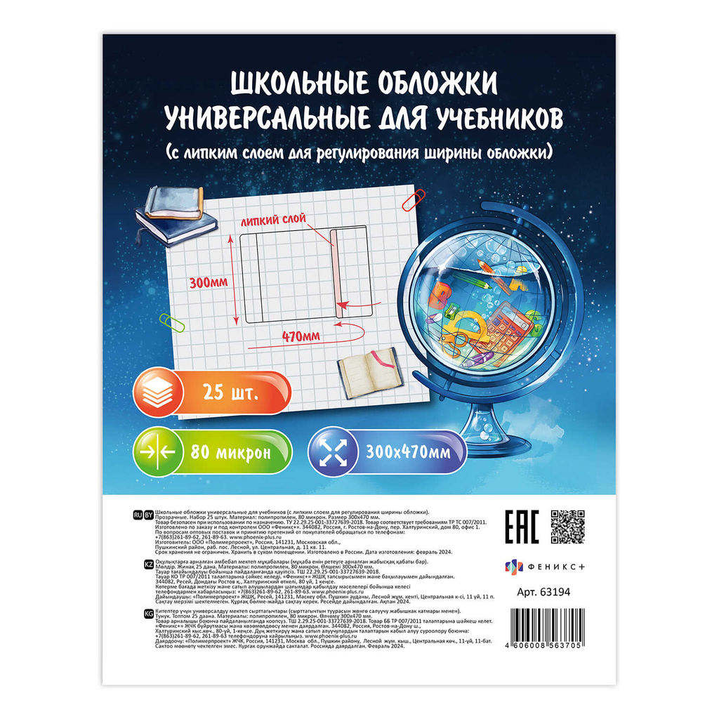 • Обложки универс. для шк.учебн. с липким слоем, арт.63194 (25 шт.),300х470 мм, ПП, 80 мкм, пошт.марк.
