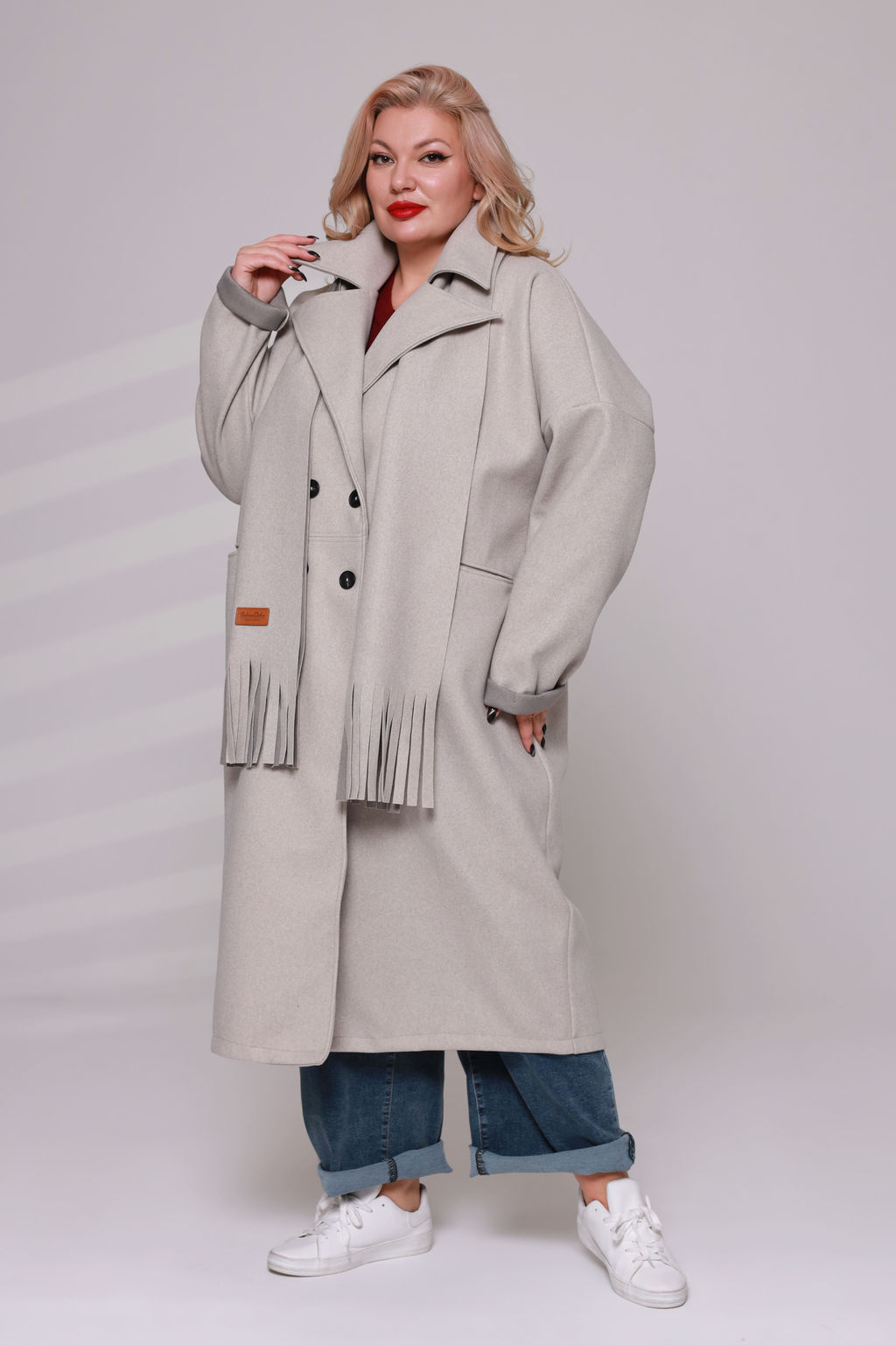 Лаконичное пальто оверсайз из мягкого материала с шарфом это универсальная вещь для холодной погоды. Глубокий V-образный вырез оформлен отложным воротником с лацканами. Приспущенные рукава полной длины по низу оформлены отворотами. Прорезные карманы по бокам добавляют модели практичности. Застегивается пальто на оригинальные пуговицы. Модель отлично сочетается с любым предметом гардероба. Вы можете сочетать его с платьями, юбками различной длины, брюками и джинсами. Пальто универсально, поэтому и одежда к нему подходит абсолютно любая. Будет стильно смотреться как с обувью на высоких каблуках, которая придает вам женственности и элегантности, так и с повседневными удобными кроссовками.­