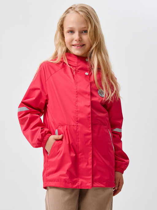 Ветровка для девочек, прямого силуэта, с втачным капюшоном. Центральная застёжка на молнию, закрытую центральной планкой на кнопках и липучке. По низу куртки кулиса с резиновым шнуром и фиксаторами для удобства прилегания. Подкладка из трикотажной сетки на полочке и спинке. На полочках 2 накладных кармана с кнопкой. На куртке расположены светоотражающие элементы. Рассчитана на температуру от +15 до +20.­