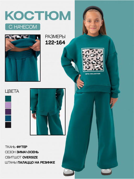 Краткое описание Теплый трикотажный костюм из футера с начесом для девочек. Спортивный костюм изготовлен из мягкого и приятного на ощупь материала на хлопковой основе производства Турция, обладает износостойкостью, не растягивается и не теряет своей формы. Начес может сыпаться или оставаться на одежде первые дни это нормальное явление обусловленное технологией производства ткани, через пару стирок оно пройдет, что никак не скажется на теплоте и плотности костюма. Состоит из свитшота с принтом и штанов палаццо. Удобное лекало, не сковывающее движений, яркий принт, современный дизайн подчеркнет индивидуальность и подарит комфорт. Кофта с модным леопардовым принтом закрывает поясницу и имеет декоративный разрез сзади. На брюках так же расположена стилизованная надпись, пояс на мягкой эластичной резинке. Отлично подойдет как детям, так и девочкам подросткам. Наш трендовый костюм - это отличный выбор для девочек, которые хотят быть яркими, модными, следят за модой и ведут активный образ жизни. Детский комплект двойка в стиле кэжел подходит для повседневного использования, прогулок, путешествий, походов в детский сад или школу, а также для особых случаев, таких как День Рождения, фотосессия, в гости, на праздник или в подарок. Флисовый детский костюм (костюм на флисе) в базовых расцветках обязательно полюбится вашим прекрасным девочкам и вам. -- Характеристики -- Состав: Футер начес 3х нитка, Хлопок 80%, пэ 20% Цвет: Изумруд