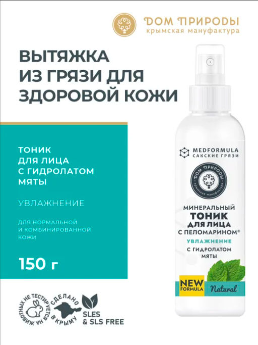 Тоник с Пеломарином и гидролатом мяты хорошо очищает кожу, уменьшает высыпания, помогает избавиться от черных точек, выравнивает цвет кожи. Пеломарин - активный комплекс на основе вытяжки из грязи Сакского озера, разработанный специалистами ТМ "Мануфактура ДОМ ПРИРОДЫ". Содержит гуминовые кислоты и фульвовые минералы. Все его компоненты обладают высокой биодоступностью - преодолевают липидный барьер кожи и проникают в мембраны клеток, снабжая их витаминами, минералами, аминокислотами и микроэлементами.