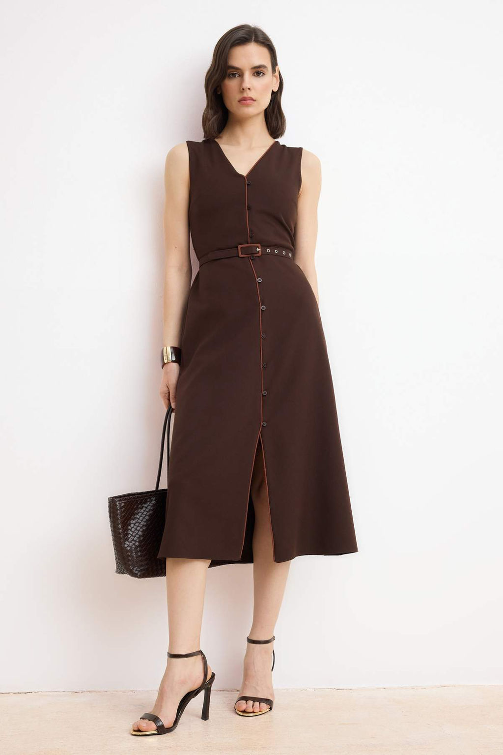 Kahverengi Kemerli Duz A Kesim Kemerli Midi Dokuma Elbise TWOSS25EL00810
