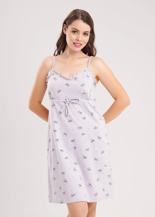 Ночная сорочка из хлопкового трикотажного полотна, А-образного силуэта на узких бретелях. Отрезной лиф с кулисой и шнуром из окантовки. По горловине переда рюша с обработкой мелкий оверлок. По пройме окантовка. По верху лифа спинки резинка.