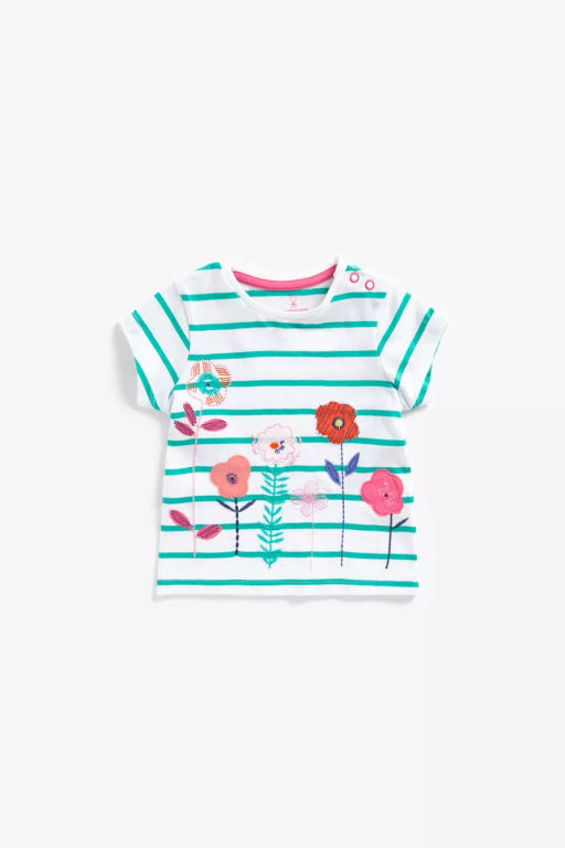 Распродажный ассортимент - это остатки коллекций, выставочные образцы с витрины, товары без упаковки, восстановленные или пользующиеся низким спросом изделия, а также продукция с незначительными дефектами внешнего вида (царапины, потертости и другие особенности). Обращаем ваше внимание, что продукция данной категории возврату и обмену не подлежит. Приобретая товары из распродажного ассортимента вы соглашаетесь на наличие дефектов во внешнем виде или упаковке. -100% Хлопок_Хлопковая футболка с коротким рукавом, украшенная узором в полоску и рисунком "Цветочки" с аппликацией, вышивкой. В размерах до 86 см предусмотрены безникелевые кнопки на плече.­