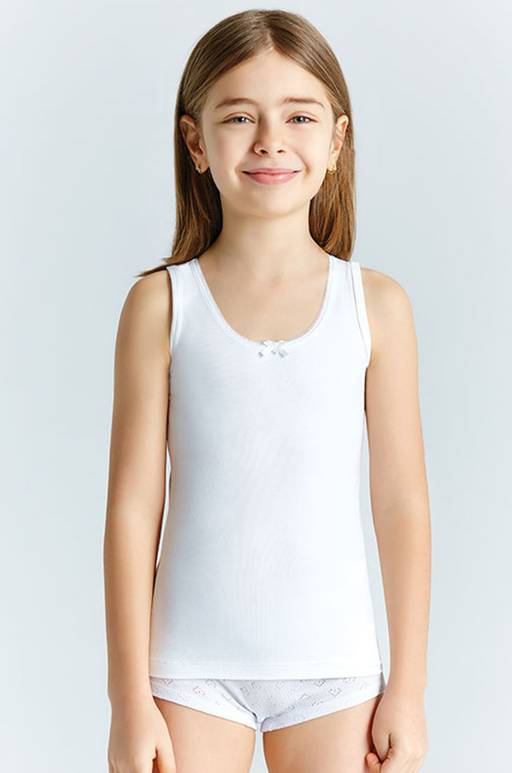 Состав: 95% хлопок, 5% эластан . Страна: Турция. Безупречная классика! Детская бельевая майка на широких бретелях для девочек и девочек-подростков выполнена из хлопка высокого качества. Маечка представлена в базовом белом цвете и украшена кружевной отделкой и атласным бантиком.