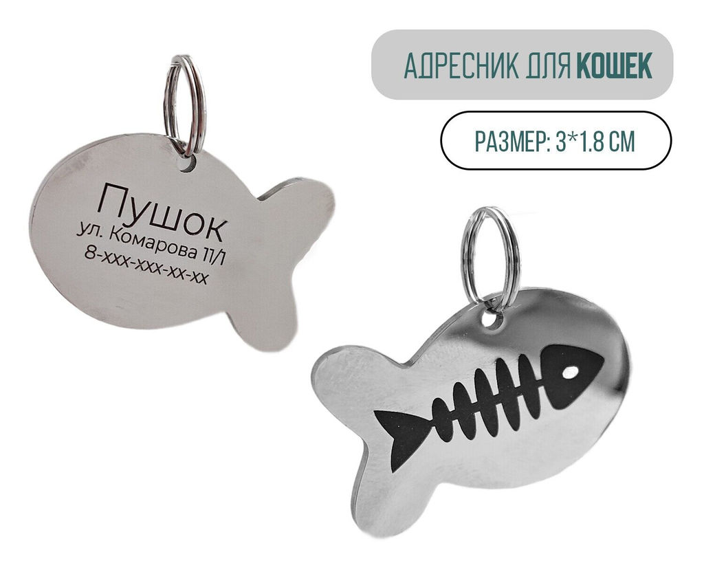 Медальон в форме рыбки или мордочки кота из нержавеющей стали, с лазерной гравировки нанесено имя вашего питомца, телефонный номер хозяина и графический дизайн.­