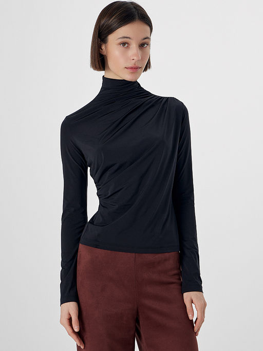 Перед и спинка изделия выполнены как одно целое, что создает гладкую поверхность без лишних швов. Изюминкой модели является изящная драпировка-сборка, заложенная сбоку спереди и в области плеча. Этот элемент добавляет женственности, создавая мягкие живые складки. Высокий воротник-стойка нежно обрамляет горло, придавая образу строгость и законченность.