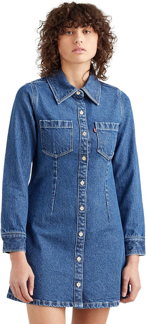 Короткое джинсовое платье Levis Sabine Mini. Выполнено из неэластичного денима. Заостренный воротник, застежка во всю длину на пуговицы, накладные карманы - все напоминает рубашку Levis, но в выраженным приталенным кроем.