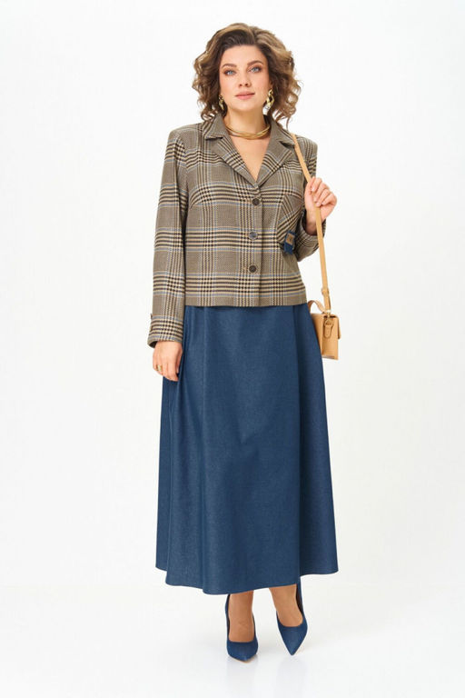 Комплект женский состоит из жакета и юбки. Элегантный женский жакет без подкладки с воротником пиджачного типа и застежкой на 3-и петли и пуговицы. По левой части переда накладной карман с декоративной нашивкой. Рукав втачной двухшовный со шлицей по низу и петлями с пуговицами. Юбка А-образного силуэта  со складками по переду, в боковых швах карманы. Для максимально комфортной посадки по бокам пояса вставлена эластичная резинка. Длина жакета 49 см, длина рукава 60 см, длина юбки 85 см.­