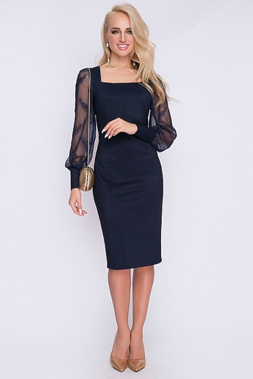 Платье из трикотажного полотна с легким блеском и вырезом каре.Рукав втачной из сетки.