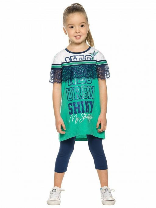 Комплект для девочек туника и лосины. Новая туника из тонкого хлопка, с перепадом длины спинки и переда, прямого свободного силуэта с мягкой линией плеча. По линии груди спереди и рукавах горизонтальное членение, вдоль которого проходит трикотажная декоративная тесьма и мягкое воздушное кружево. Принт с разноцветным глиттером в виде птички колибри и надписей. Перевод Нео, Урбан, Блестящий, Мой стритстайл. Классические укороченные лосины.