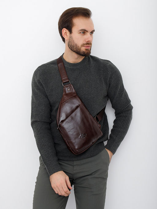 Мужской рюкзак, выполнен из натуральной кожи. Дополнен темной серебристой фурнитурой. Данная модель закрывается на молнию, носится на одном плече. Каркас полужесткий. Встроенный ремень перестегивается.