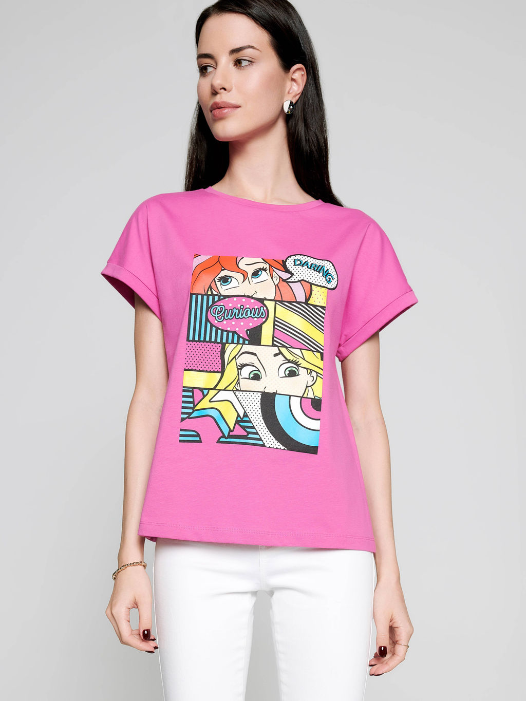 Ярко-розовая футболка с рисунками по лицензии Disney в стиле комиксов сочетает в себе минимализм и главные тенденции уличной моды.