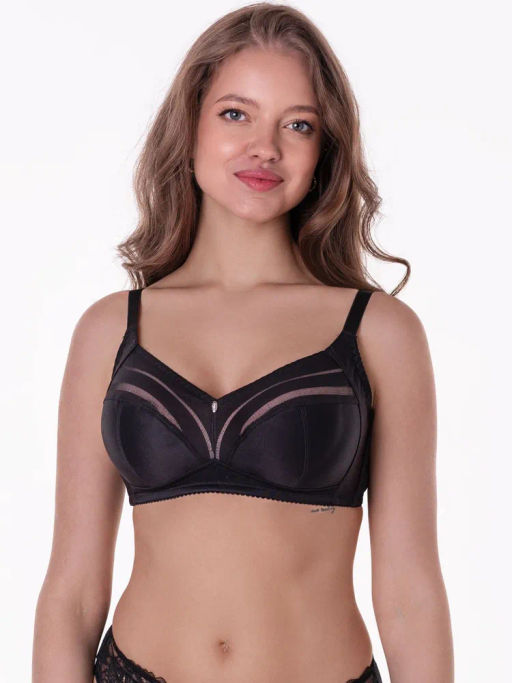 Мягкая чашка без каркасов. Ластовица, нижние детали чашки и боковая корректирующая деталь выполнены из неэластичного трикотажного полотна с ламинатом из хлопка для обеспечения комфорта и функциональности. Верхняя деталь чашки декорирована кружевом на эластичной упругой сетчатой подкладке, что визуально облегчает модель,сохраняя функциональность. Упругие пластины в боковых деталях стана для обеспечения фиксации на теле и наилучшей посадки. Боковые детали стана выполнены из эластичного трикотажного полотна. Также данная модель доступна в расширенном размерном предложении на полноты HIJ и обхваты 100-120