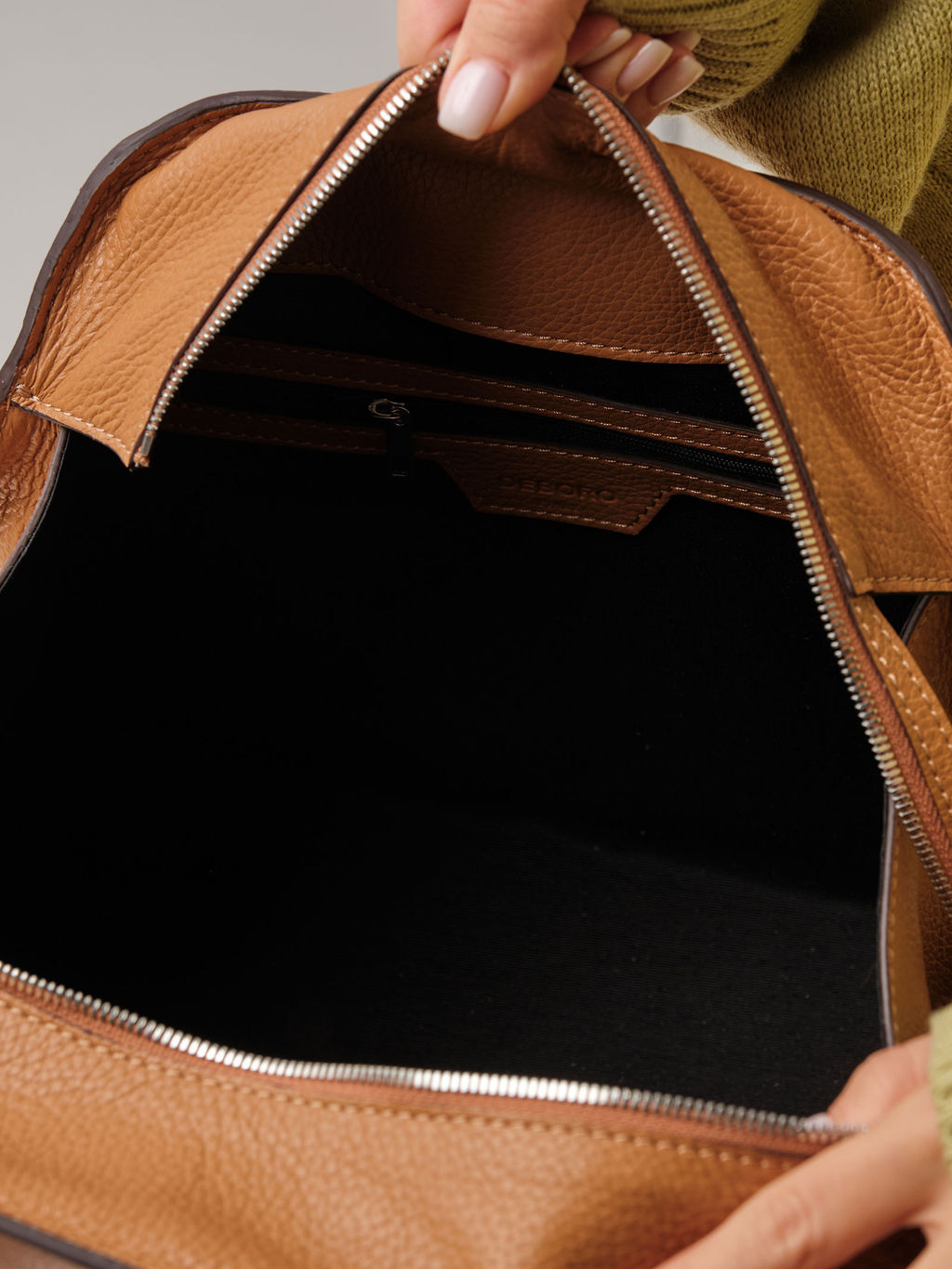 Детали: натуральная кожа, 2 ручки, 1 внутреннее отделение с хлопковой водонепроницаемой подкладкой, 1 внутренний закрытый карман на молнии, застежка на металлическую молнию с кожаным пуллером, съемный нерегулируемый плечевой ремень, металлические ножки.­
