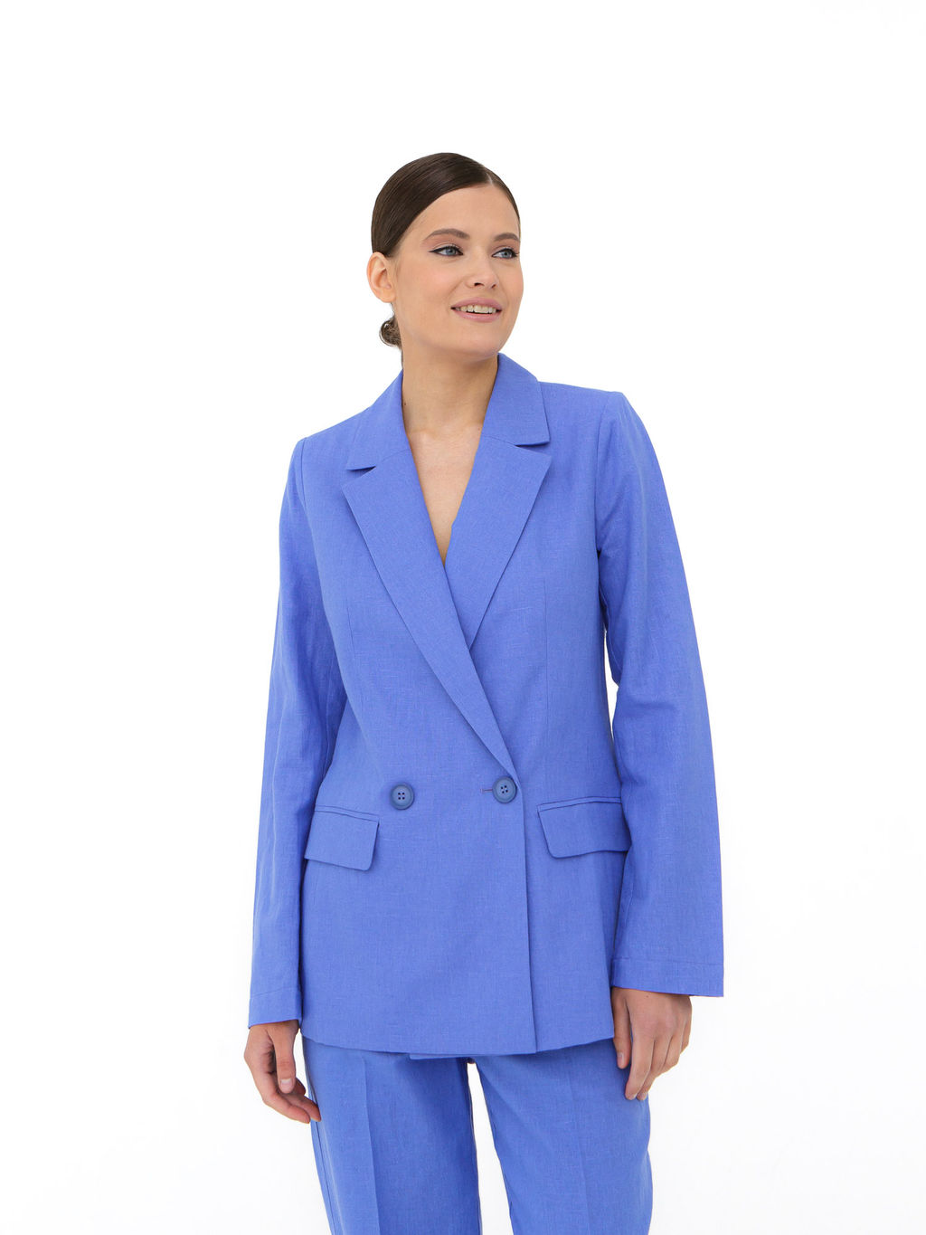 Жакет из льна и хлопка цвета василек стильное и практичное решение для теплого времени года. Материал сочетает в себе легкость льна и мягкость хлопка, обеспечивая комфорт и воздухопроницаемость. Жакет имеет двубортную застежку, классические лацканы и накладные карманы, создавая элегантный силуэт. Этот яркий оттенок добавит изюминку любому образу, подходя как для деловых встреч, так и для повседневных прогулок