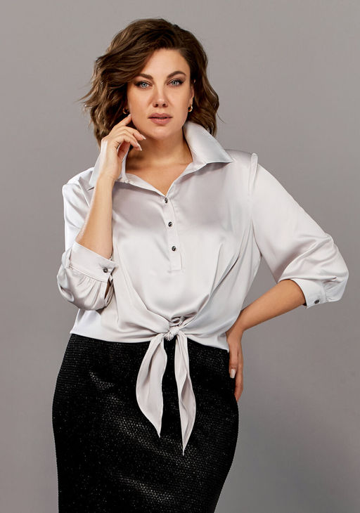 Блузка из мягкого блузочного атласа, прямого силуэта, с рубашечным воротником и застежкой на три пуговицы на планке до середины блузки. По переду блузка удлинена и  низ переходит в завязку. Рукав трехчетвертной на манжете, на одну пуговицу.