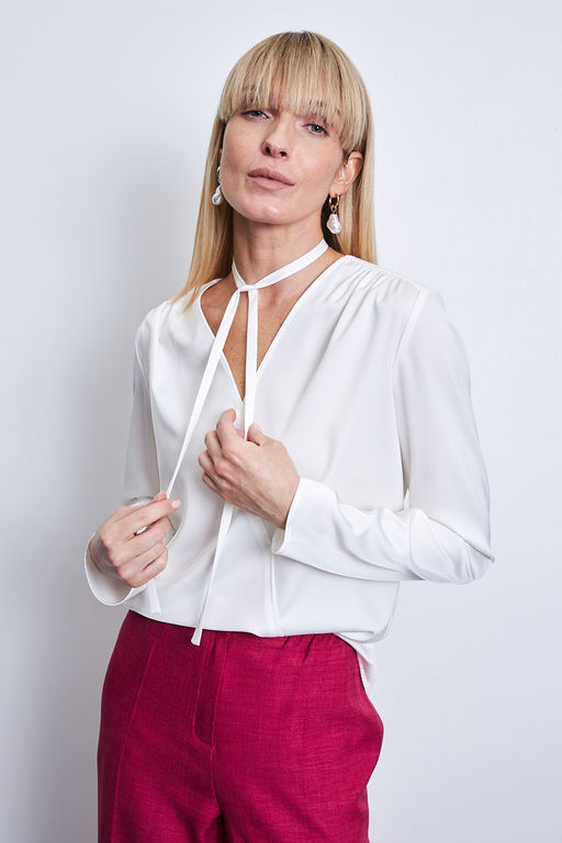 Стильная блузка в молочном оттенке. Крой отличает глубокий V-образный вырез и завязки.