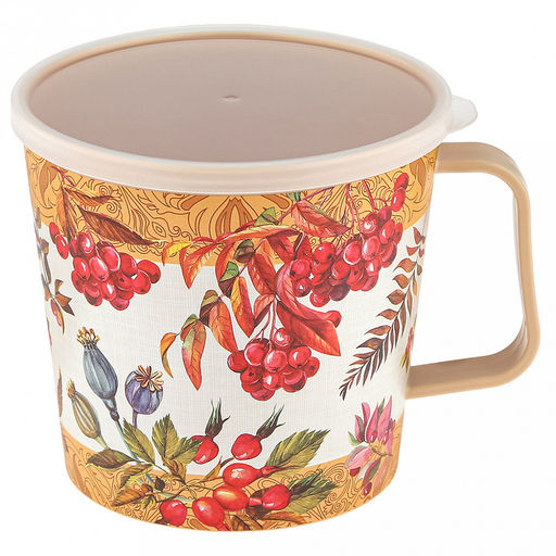• Контейнер-кружка пластмассовый 0,75л, д11,2см, 10,5см, с крышкой, с клапаном, бежевый, с декором, подходит для СВЧ (Россия)