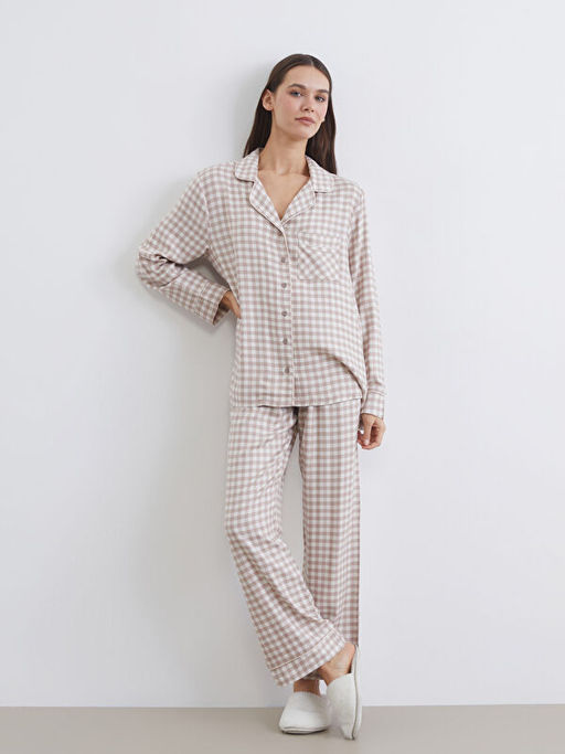 G?mlek Yaka Ekose Kad?n Pijama Tak?m?