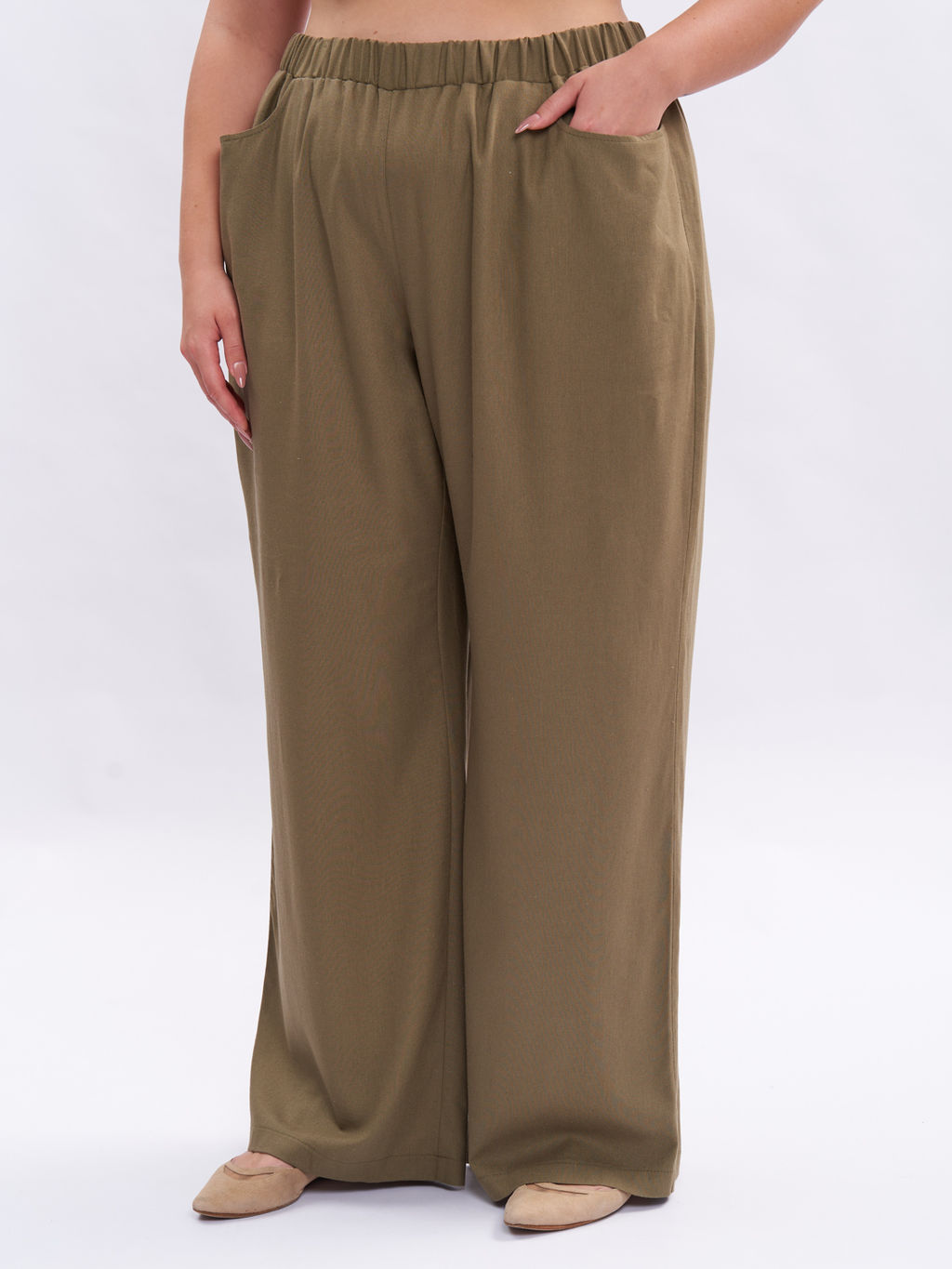 Льняные брюки на резинке больших размеров темно-зеленые в оттенке табак Летние женские штаны с высокой посадкой отлично подходят для полных девушек в размере plus size. Прямые брюки свободного фасона оверсайз дополнены кокеткой и накладными карманами сзади. Спереди удобные подкройные карманы создают стильный и современный вид. Модный цвет хаки с коричнево-болотным подтоном. Брюки декорированы модной отстрочкой по швам, что делает их трендовыми и необычными. Они прекрасно подойдут для повседневной носки, легко сочетаются с разными нарядами и базовыми образами. Их можно надевать на пляж или на городскую прогулку. Размер на модели 60-62 Параметры модели: рост 178, 107/87/128 Как выбрать размер -- Характеристики -- Сезон: Лето Материал: Лён Состав?01) 100% хлопок 02) 95% хлопок, 5% эластан 03) 60% вискоза, 40% хлопок 04) 60% вискоза, 40% хлопок 05) 75% хлопок, 25% полиэстер 06) 50% вискоза, 35% полиэстер, 10% шерсть, 5% эластан 07) 65% полиэстер, 25% вискоза, 10% эластан: 70% вискоза, 30% лён Цвет: зеленый Принт: однотонный Стиль: Для полных, Повседневный Силуэт: Прямой Особенности: большие размеры, оверсайз Карманы: Накладные, Подкройные Застежка: Резинка Стирка: Деликатный режим, не более 30 градусов, без барабанной сушки Страна производства: Россия В наличии: Да