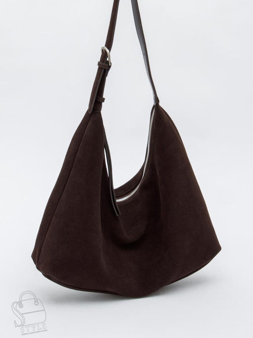 Модель-хобо, выполнена из замши. Дополнена серебристой фурнитурой. Данная модель закрывается на молнию, носится в руке за встроенный ремень с регулировкой длины. Каркас мягкий.