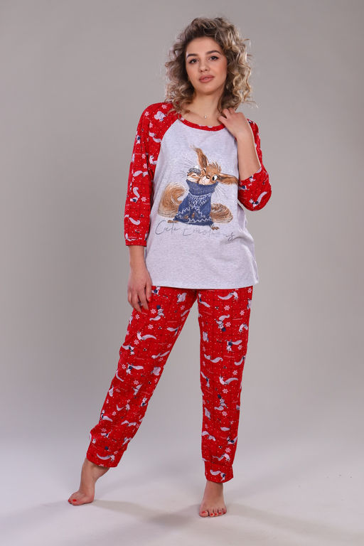 Комплект состоит из брюк и кофты. Брюки длинные с манжетом внизу. Кофта с укороченным рукавом реглан на манжете, имеет декоративную печать в стиле шелкографии с добавлением глитерра.