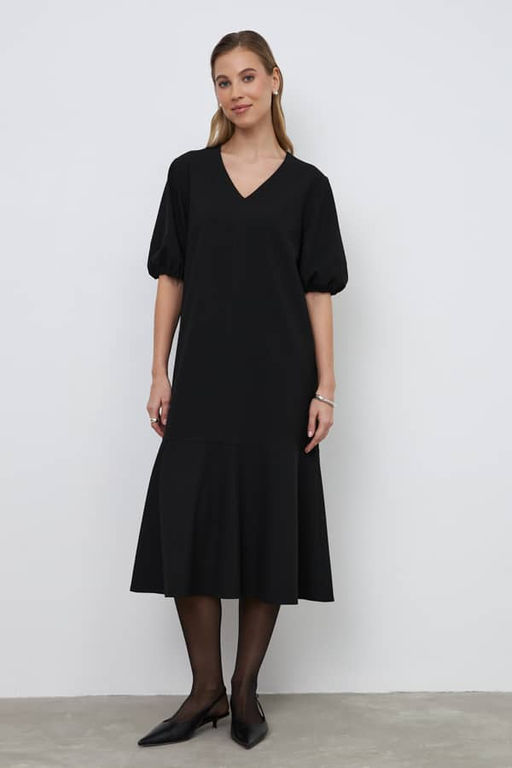 Платье свободного силуэта из плательной ткани. По центру передней части изделия и спинки выполнен шов. Цельнокроеная стойка, переходящая в V-образный вырез горловины, визуально делает фигуру стройнее. Втачной короткий рукав, по низу рукава сборка на резину. Низ изделия украшен широким воланом.