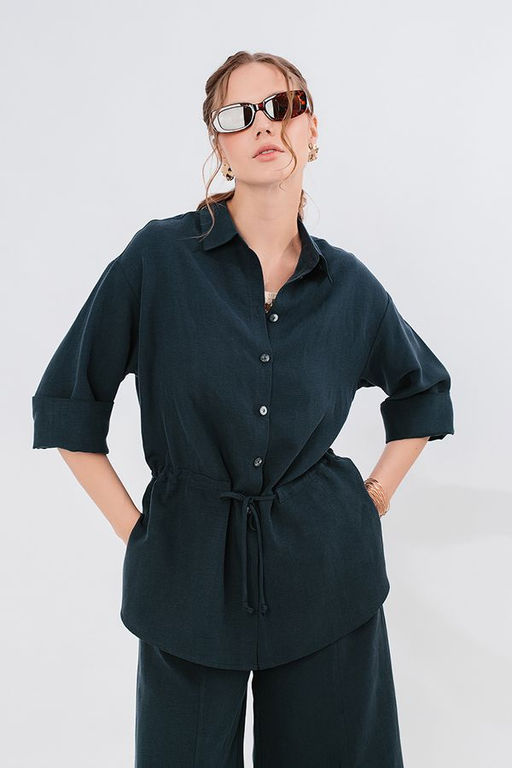 Стильная рубашка свободного силуэта. Застежка на пуговицы, на поясе кулиска, по боковым швам разрезы. По спинке кокетка. Рукав 38 см в расправленном виде, с возможностью подворота. Длина по спинке 77 см. Размер модели на фото: 46. Параметры модели: 94-65-100. Рост модели на фото: 175 см.